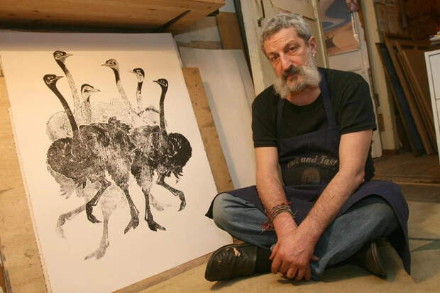«Это цинковая, медная или, бывает, стальная пластинка, которая покрывается специальным лаком, который потом коптится, на которую наносится рисунок, и иголочкой ты процарапываешь рисунок (ну так, я примитивно рассказываю), — пояснял художник. — А потом кладется это в кислоту, и там, где ты процарапал, там кислота работает, она проедает вот эту вот бороздку, линию твою. А все остальное покрыто лаком и остается нетронутым. И после, когда это все смывается, ты набиваешь краску, она попадает в штрихи, потом она сверху стирается крахмальной марлей, газетой вот этим местом, рукой, потом печатается в станке через фетр, специальная бумага офортная, бесклейная при сильном давлении прижимается к этой твоей пластинке, и ты получаешь обратный оттиск, вот так сказать примитивно»