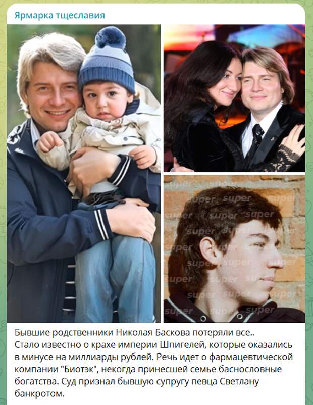 Недавно суд официально признал экс-супругу Николая Баскова, Светлану Шпигель, банкротом, поставив точку в истории былого величия.Однако предвестники беды появились задолго до финансового коллапса. Всё началось с громкого уголовного дела в отношении главы семьи, Бориса Шпигеля, после которого он лишился не только несметных богатств, но и былого влияния. Дочь отчаянно пыталась спасти семейное дело, но, несмотря на все усилия, удержать тонущий корабль на плаву не удалось.